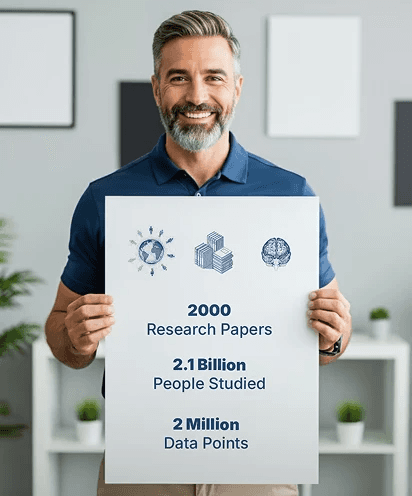 Our world-class team of medical, data, and behavioural scientists has synthesised 2,000 research papers - a comprehensive review covering 2.1 billion people - to isolate the critical drivers of healthspan and longevity.